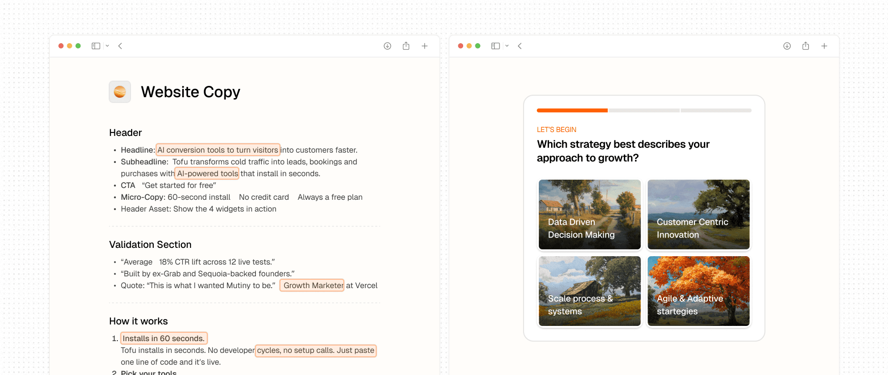 Tofu generates quizzes that fit your product, brand, and funnel moments, for free. Engage visitors, qualify intent, and move them to their next step.